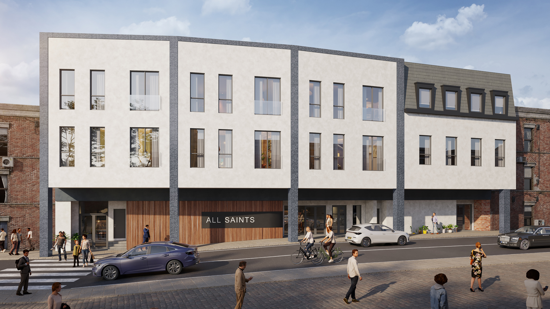 Every apartment in All Saints has been meticulously designed to offer the best in contemporary living. Inside, you will find high-specification finishes, including stylish, fully-fitted kitchens with integrated appliances and elegant, modern bathrooms. Large windows flood the open-plan living spaces with natural light, creating a bright and welcoming environment for residents.